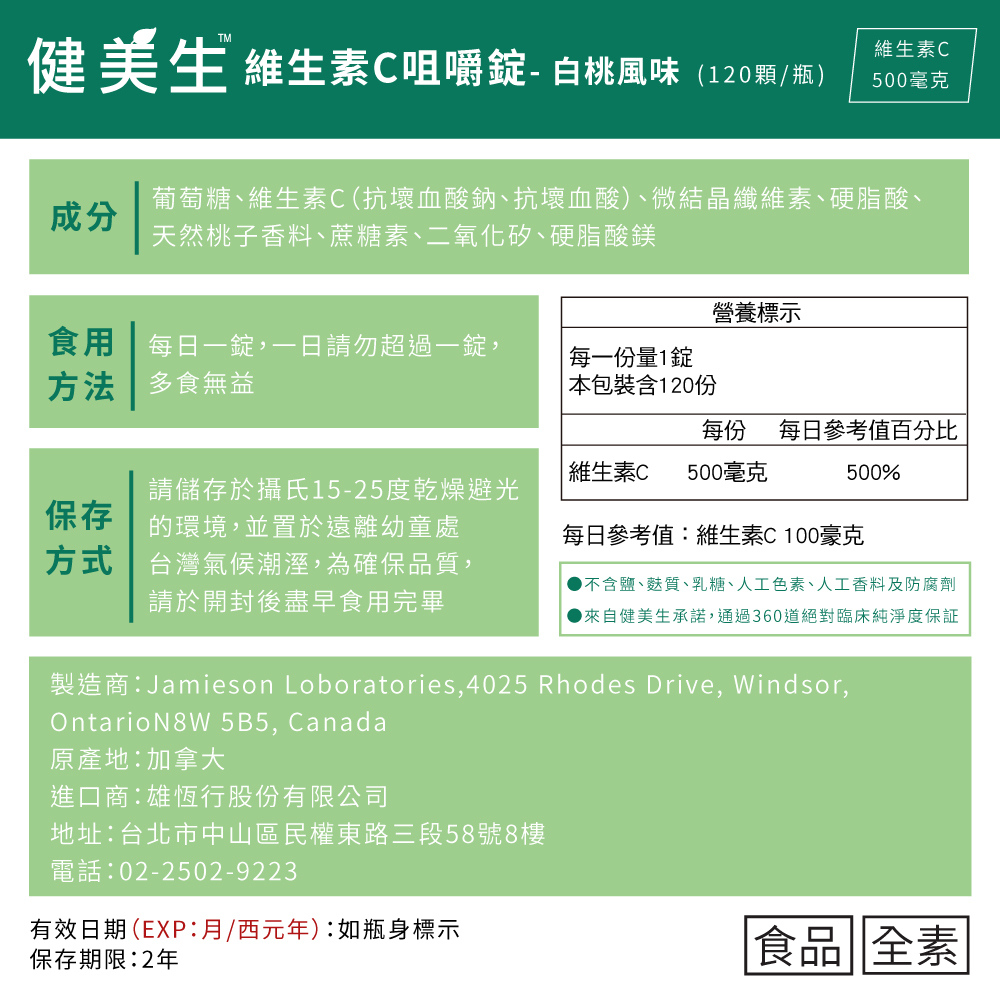 維生素C咀嚼錠-白桃風味 (兒童/成人) 120錠/瓶