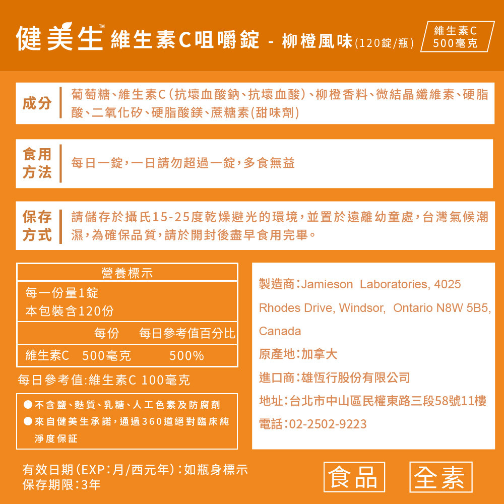 維生素C咀嚼錠-柳橙風味 (兒童/成人) 120錠/瓶